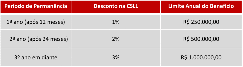 - Bônus de Adimplência Fiscal: Desconto no pagamento à vista da CSLL dentro do vencimento, variando de 1% a 3%, de forma progressiva conforme o tempo de permanência no programa;
